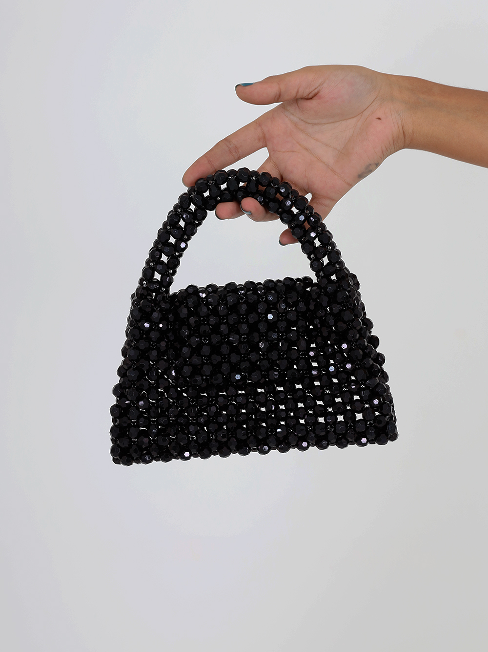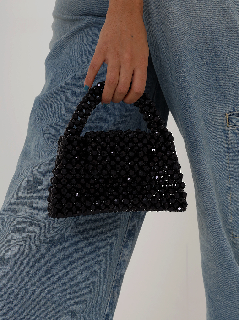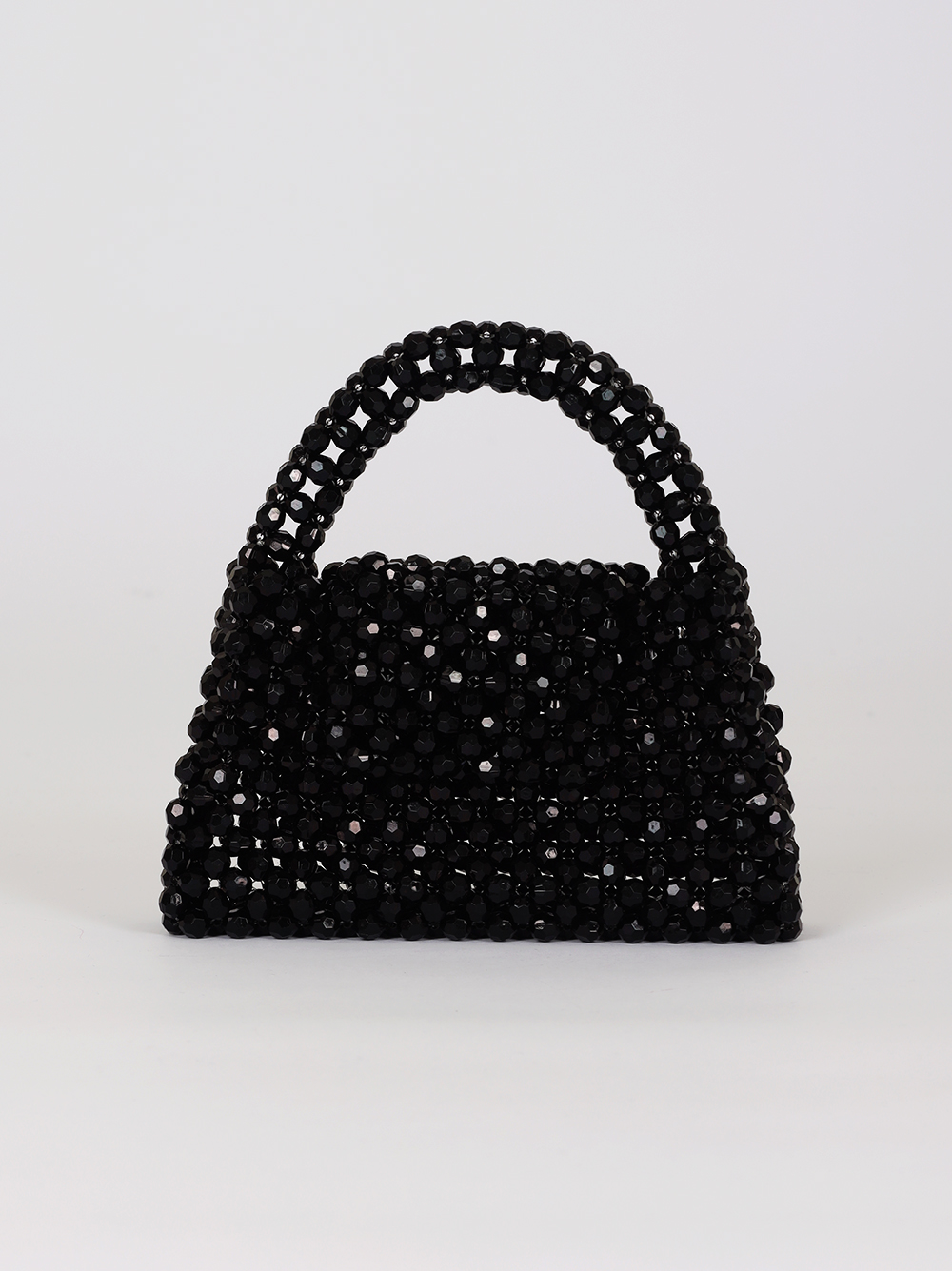 The Féroce bag is a bold statement piece, handcrafted from deep garnet acrylic beads that create a rich, faceted shine. Its structured shape, curved top handle, and seamless beaded flap make it both elegant and eye-catching.