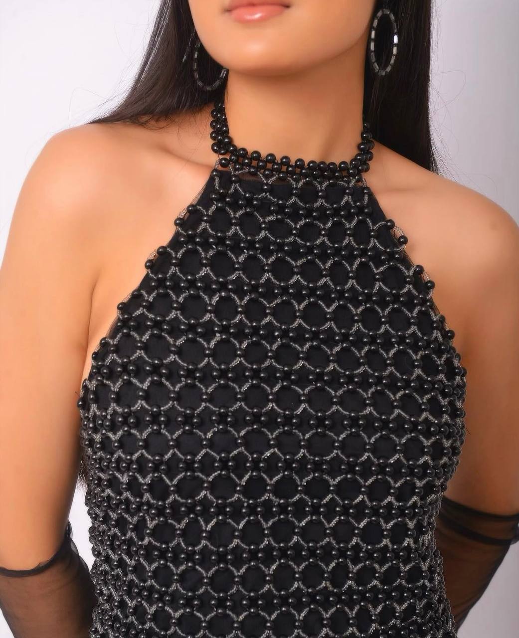 Our ‘leia’ halterneck bustier showcases our signature hand-beading technique. Meticulously crafted from black acrylic and silver glass beads, each piece is entirely handmade and set on a delicate organza lining. Light, eclectic, and effortlessly elegant, it’s the perfect statement piece for weddings and special occasions.